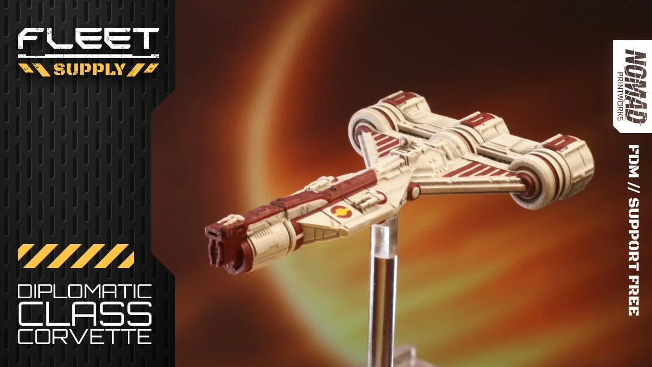 This pack contains STL files for a Diplomatic Class Corvette, designed to serve as a tabletop proxy for small base sizes. The kit includes four ship variants: two Republic models, an unarmed Diplomat version, and a Rebel variant. It also features printable tokens for ship and base cards.