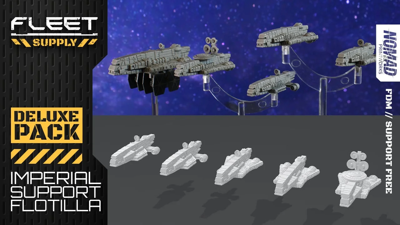 A collection of 3D printable Imperial-style support flotilla miniatures designed for tabletop gaming. The pack includes five ship variants, larger single-peg versions, and an extra-large version capable of mounting miniature fighters. The models are optimized for FDM printing with a 0.2mm or 0.25mm nozzle and are designed to print entirely without supports. Printable base cards, a flotilla stand, and solid, resin-friendly versions are also included.