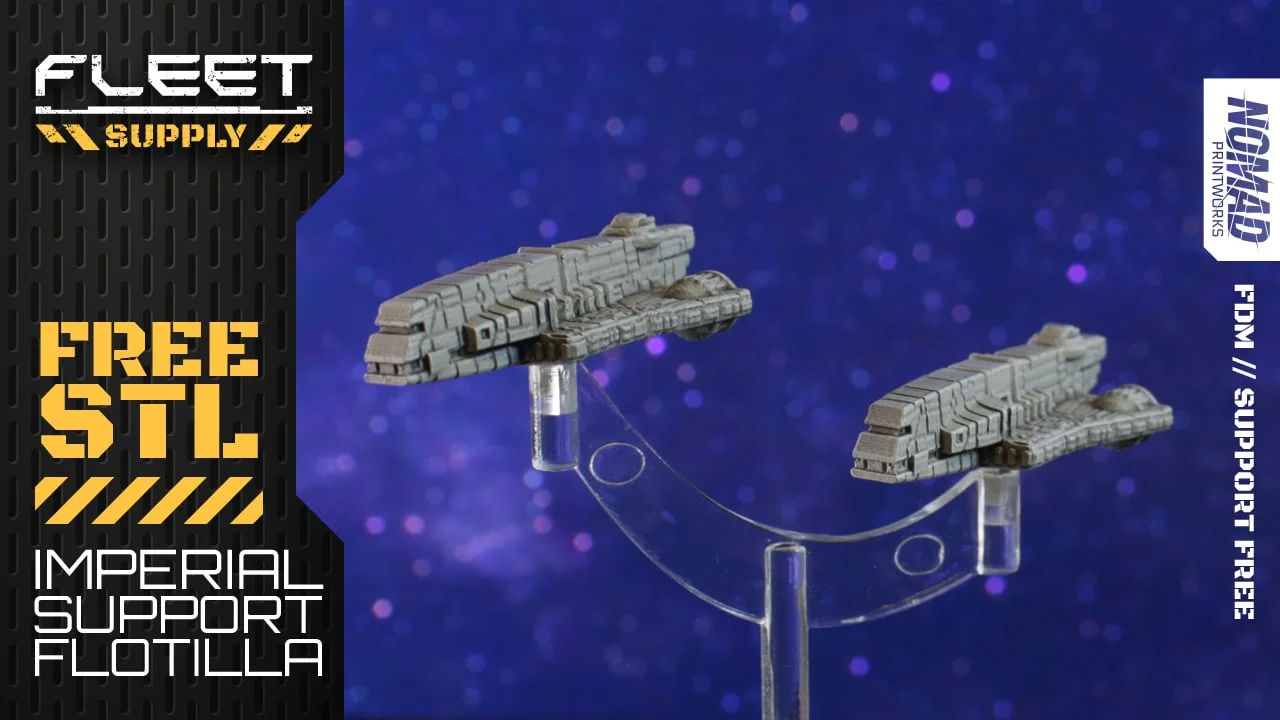 This package provides 3D printable support flotilla models designed for expanding tabletop gaming fleets. The free version includes a standard flotilla variant optimized for FDM printing, alongside an untested solid version intended for resin SLA printing. The primary FDM model is engineered to print entirely without supports and is recommended for use with 0.2mm or 0.25mm nozzles.