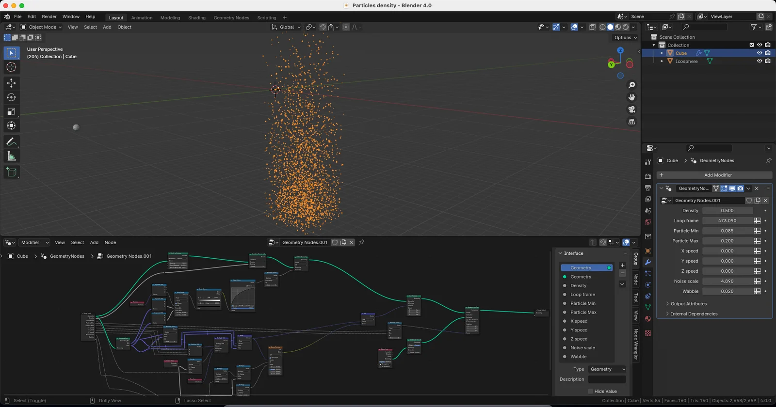 Floating Particles is a Geometry Nodes setup that allows users to create various particle effects within Blender. It was originally designed to simulate atmospheric molecule density, featuring higher density at lower levels and lower density at higher altitudes. This capability enables the generation of effects such as dust, falling snow, rain, and underwater particles. The node setup provides control over particle density, allowing users to adapt it for different environmental and atmospheric scenes.