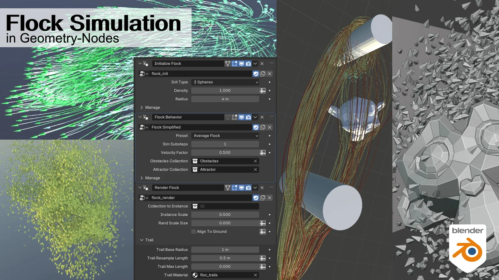 The system is organized across three modifier slots dedicated to initialization, behavior, and rendering. The initialization stage defines starting entity counts and positions, while the behavior logic runs the simulation itself. The rendering setup handles instancing aligned objects onto the generated entities. Users can adjust simulation bounds with parameters like visibility radius, friction, velocity momentum, and substeps. It also allows flocks to interact with scene geometry, enabling them to pursue target attractors or dynamically avoid designated obstacles.