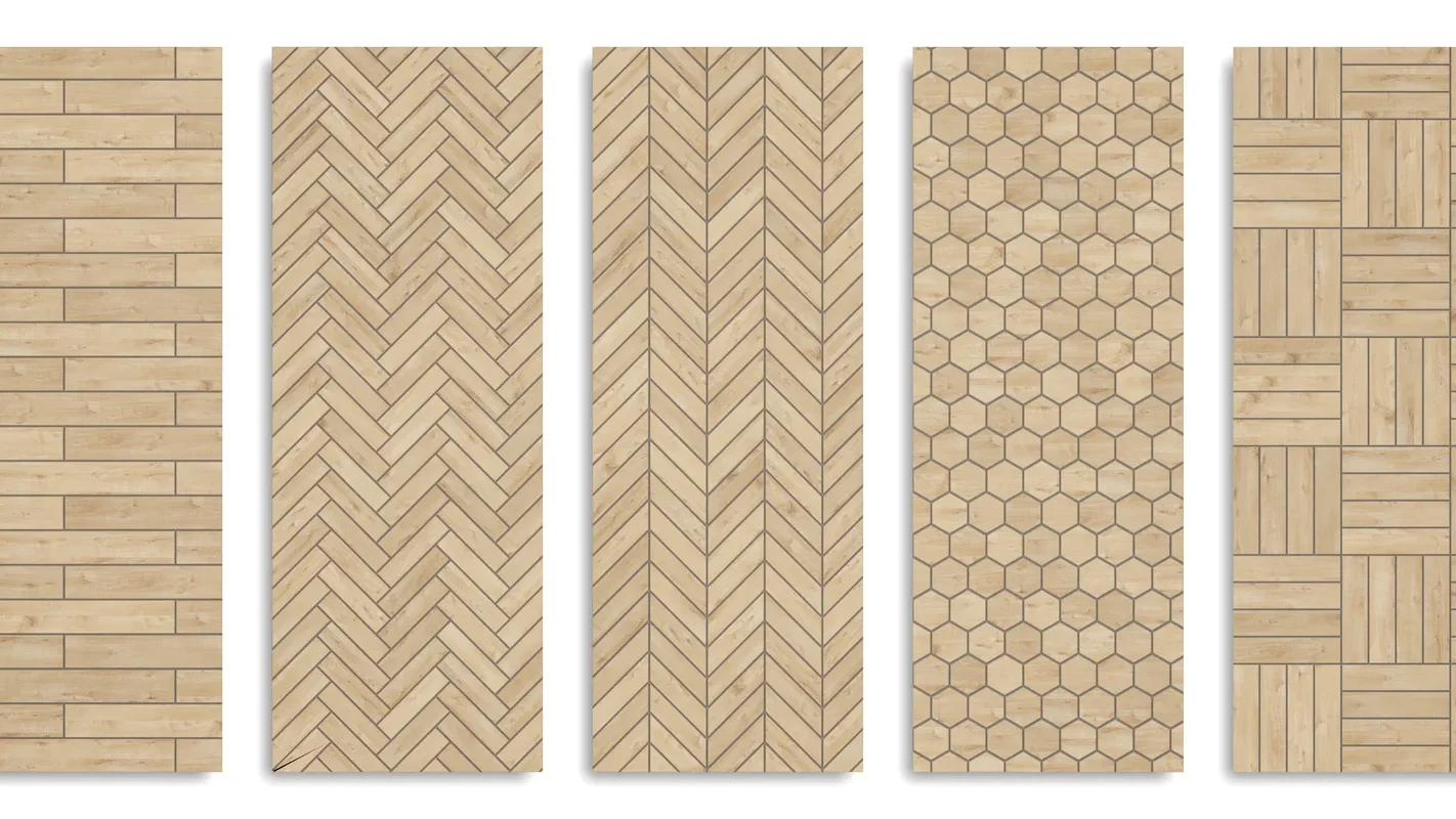 The tool natively handles UV mapping by assigning isolated sections to each generated element. It supports two primary material mapping workflows: a multi-texture node structure that accommodates up to eight distinct image textures, and a seamless layout that applies randomized UV offsets to individual planks using a single seamless material. The source file includes 56 pre-configured materials covering wood and tile variations, designed to integrate with the Asset Browser.