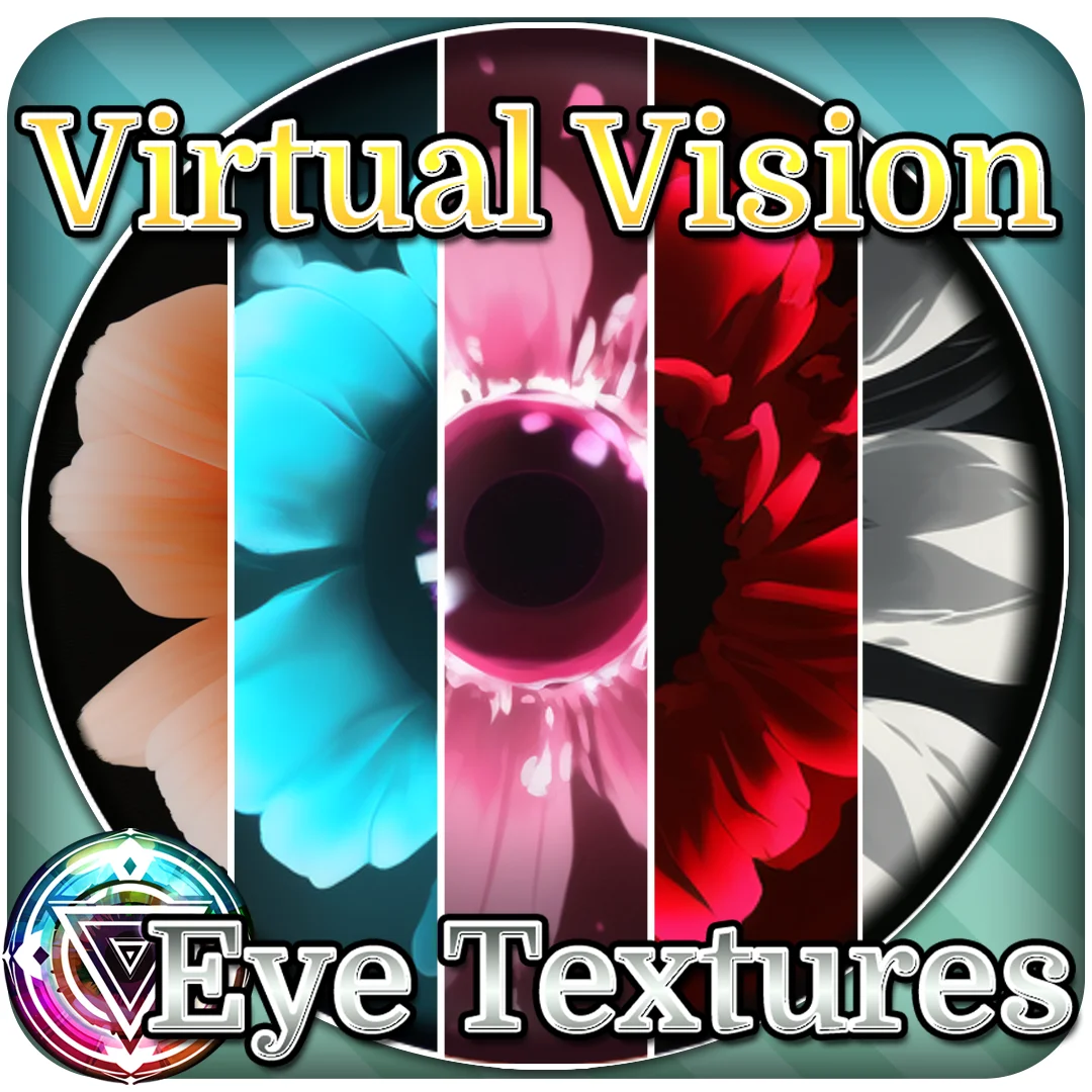 A collection of 15 flower-themed eye textures suitable for anime-style characters, virtual avatars, and 3D models. The textures are provided in PNG format and feature bright, vibrant designs with circular pupils.