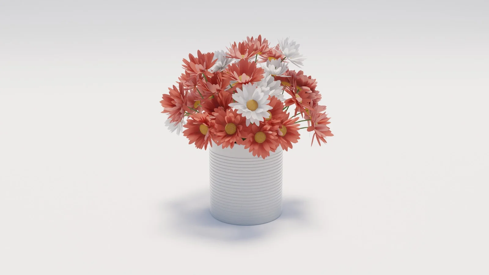A 3D model featuring red and white flowers arranged in a white vase. This decorative asset is suitable for interior scenes, such as table centerpieces or shelf displays. The product includes both a native Blender file and standard OBJ and MTL formats for compatibility with various 3D applications.
