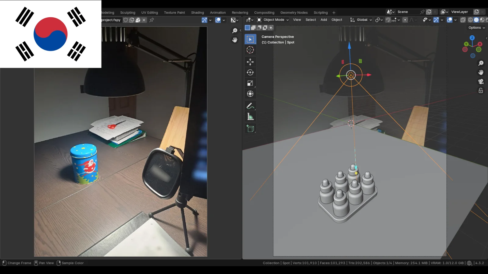 This Korean-language PDF tutorial covers the process of matching a 3D camera to a photograph using fSpy in Blender 4.x. It serves as part one of a series, focusing on establishing the initial scene setup and camera perspective required for integrating 3D models into 2D images. The guide prepares users for subsequent compositing and shadow-catching workflows.
