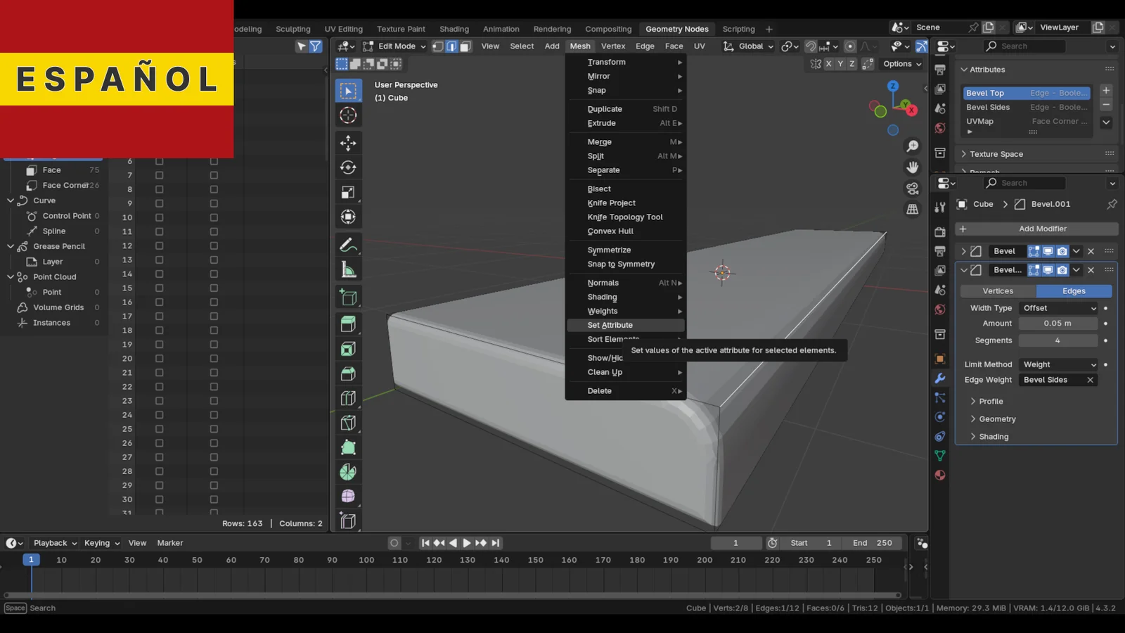 This educational resource explains how to define custom attributes for object edges in Blender and apply them using the Bevel modifier. It focuses on using the Edge Weight section to achieve non-destructive bevels on specific parts of a mesh. The material is provided as a PDF companion to a video tutorial covering the same workflow.