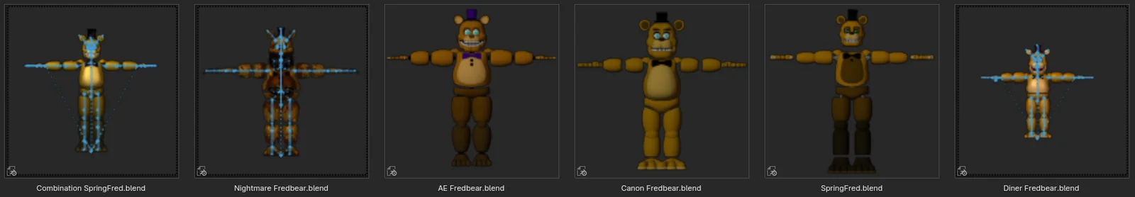 This product is a collection of seven unreleased stylized 3D character models inspired by the Five Nights at Freddy's franchise. The pack includes several variations of animatronic characters such as AE Fredbear, Canon Fredbear, Combination Springfred, Diner Springfred, Nightmare Fredbear, and Unnamed Springfred. The models are provided in different states of completion, with some lacking textures or materials. Textured assets are formatted for Blender 2.79, while the untextured models are formatted for Blender 4.0.