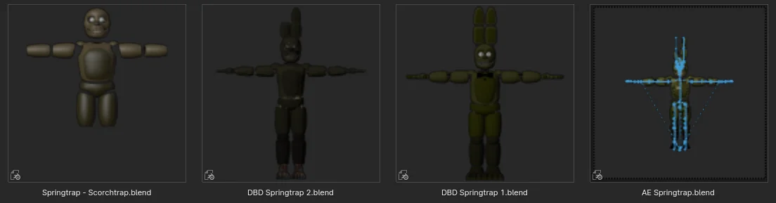 This pack contains four unreleased, stylized Springtrap character models inspired by the Five Nights at Freddy's franchise. The collection includes the AE Springtrap, two Dead by Daylight styled Springtraps, and a Burntrap styled variant. Due to being pulled from an archive of unreleased work, some models retain their original textures and are formatted for Blender 2.79, while others are provided as untextured geometry formatted for Blender 4.0.