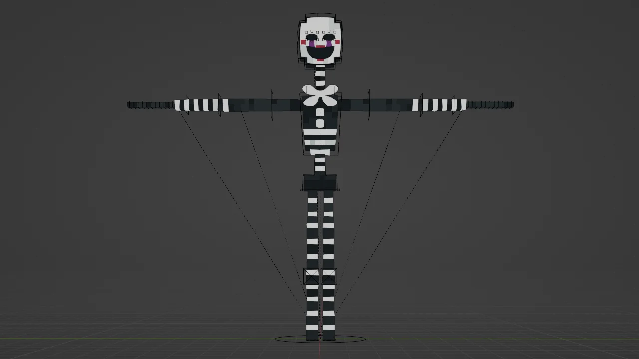 A rigged 3D character model based on the Puppet from Five Nights at Freddy's Plus. The design incorporates custom visual elements inspired by community fan art. The asset includes the base mesh, textures, and a complete armature setup ready for posing and animation workflows.