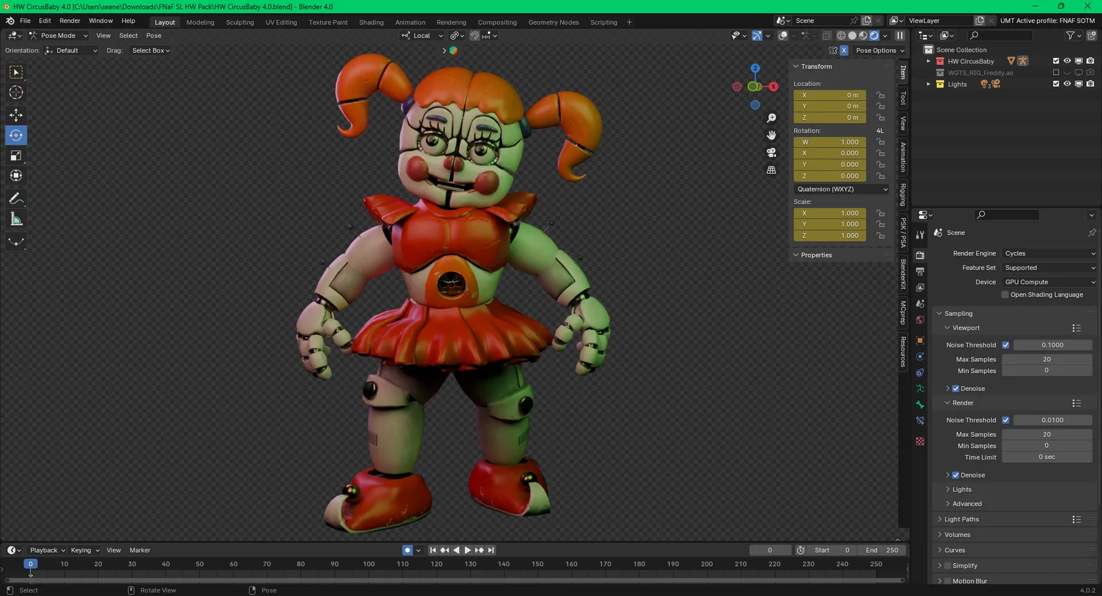 A collection of rigged character models extracted from the game Five Nights at Freddy's: Help Wanted. The pack is configured for Blender 4.0 and includes animatronic models from the Sister Location series. Ballora, Bidybabs, and Minirenas are not included in this collection, as they do not appear in the source game files.
