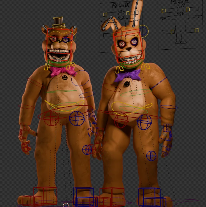 Two rigged character models based on the Five Nights at Freddy's franchise, designed with a VHS and analog horror aesthetic. The models come equipped with procedural materials and custom bone shapes for ease of use. The included armature features an IK/FK switch to provide flexibility during animation.