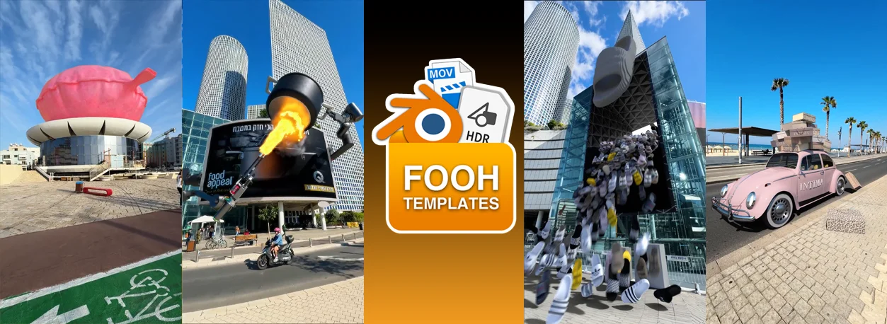 This collection provides eight ready-to-use project templates designed for integrating 3D models into live-action footage. Each template includes pre-tracked video of real urban environments alongside configured 3D camera and lighting setups. The provided Blender files serve as a foundation for adding custom models and animations to create faux out-of-home (FOOH) visual effects, bypassing the initial motion tracking and scene configuration.