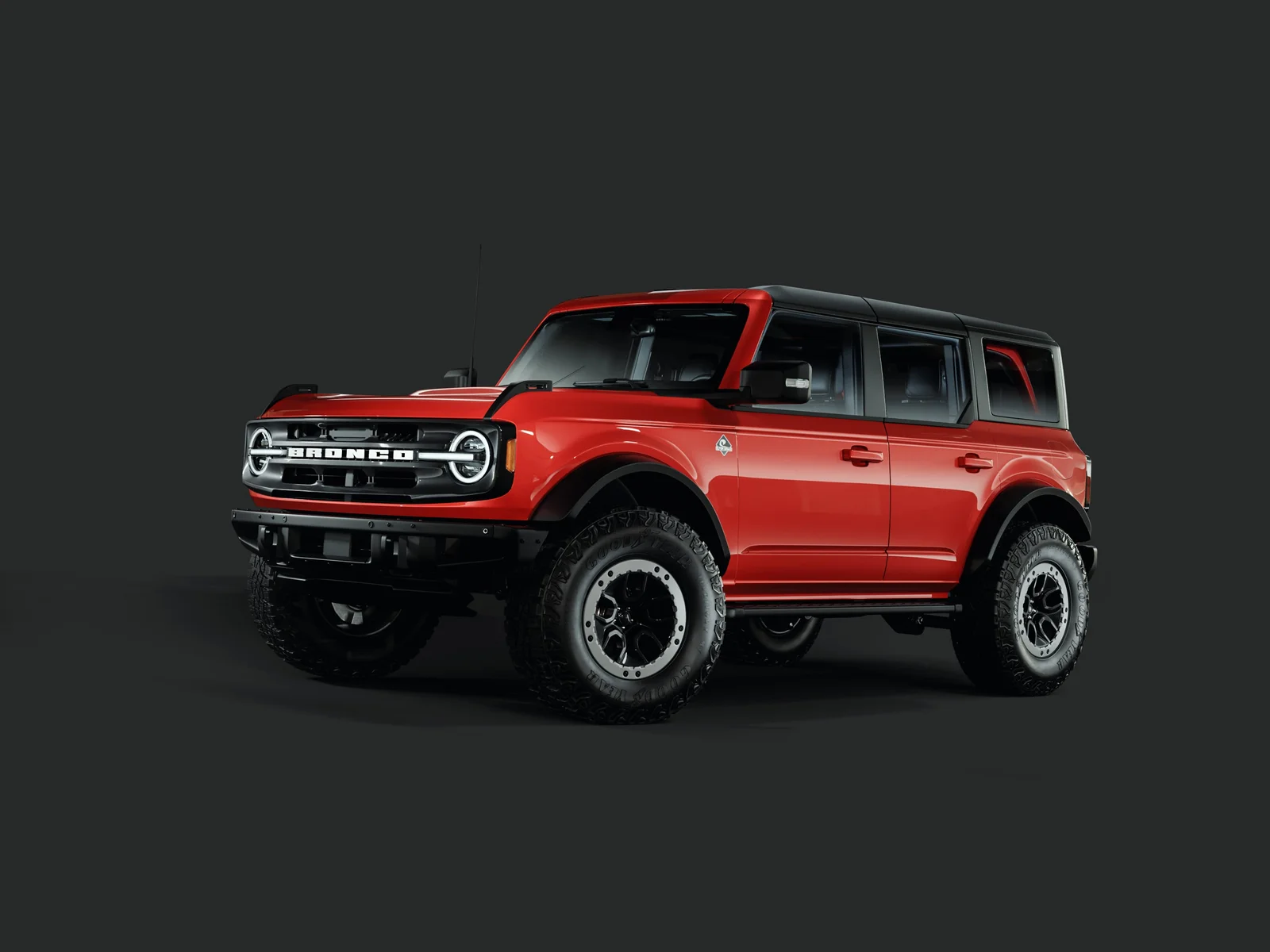 This 3D model represents the 2021 Ford Bronco (U725), created natively in Blender using real-world dimensions and perspective image modeling for accuracy. The vehicle features interactive elements including openable and removable doors, a removable roof, and a fully modeled suspension system.