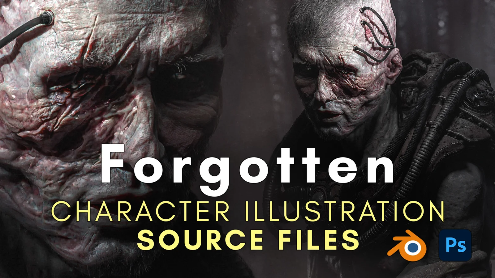 This product provides the complete source files for the Forgotten character illustration. It includes the original Blender project file alongside the final Photoshop document. The scene contains a fully colored and textured high-resolution character model consisting of approximately six million faces. The artwork utilizes vertex color data created through the attribute painting system.