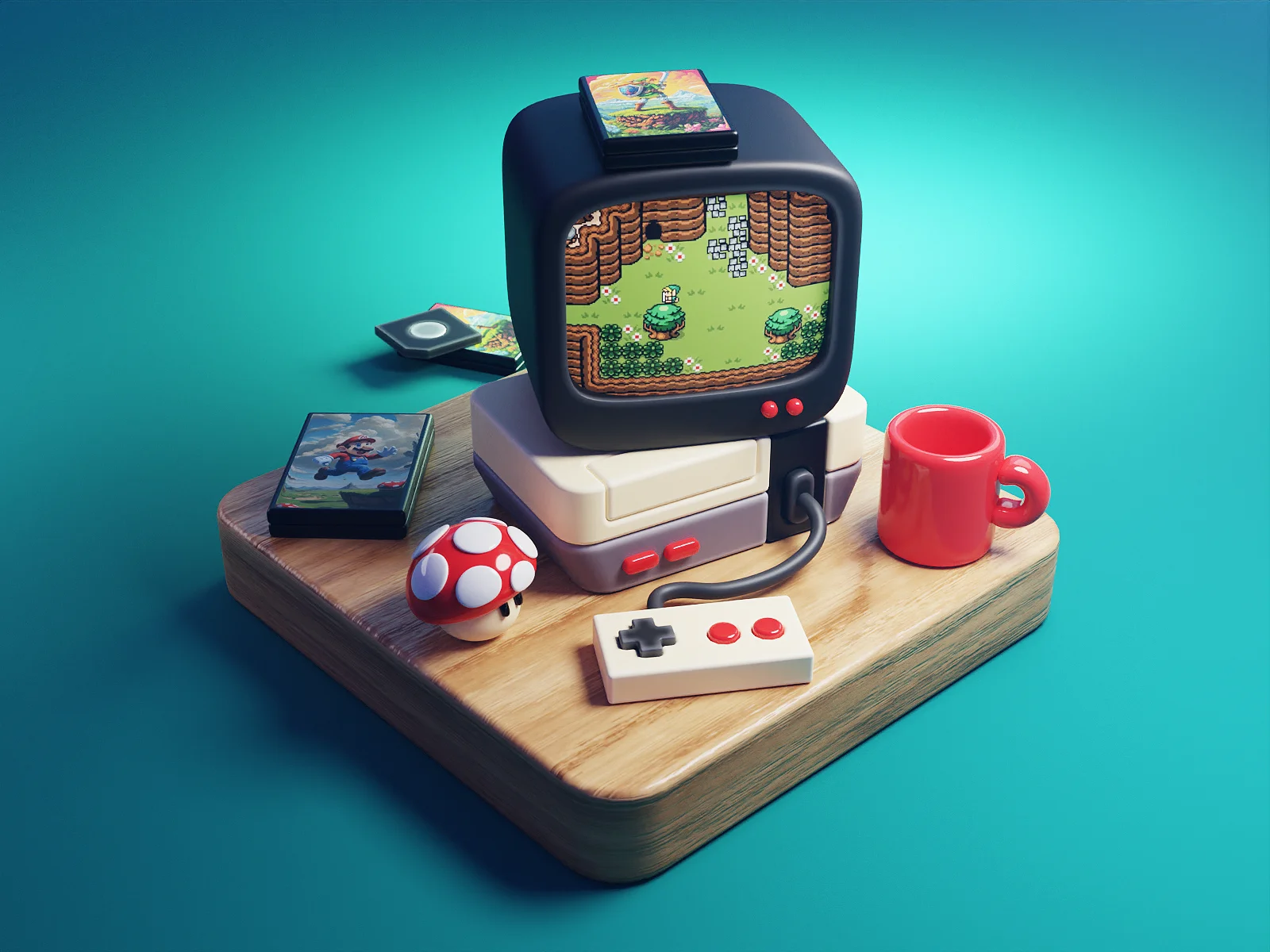 A complete 3D scene featuring a retro game console created in Blender. This project file serves as the final companion asset to a YouTube modeling tutorial produced by Polygon Runway, allowing users to examine the finished composition.