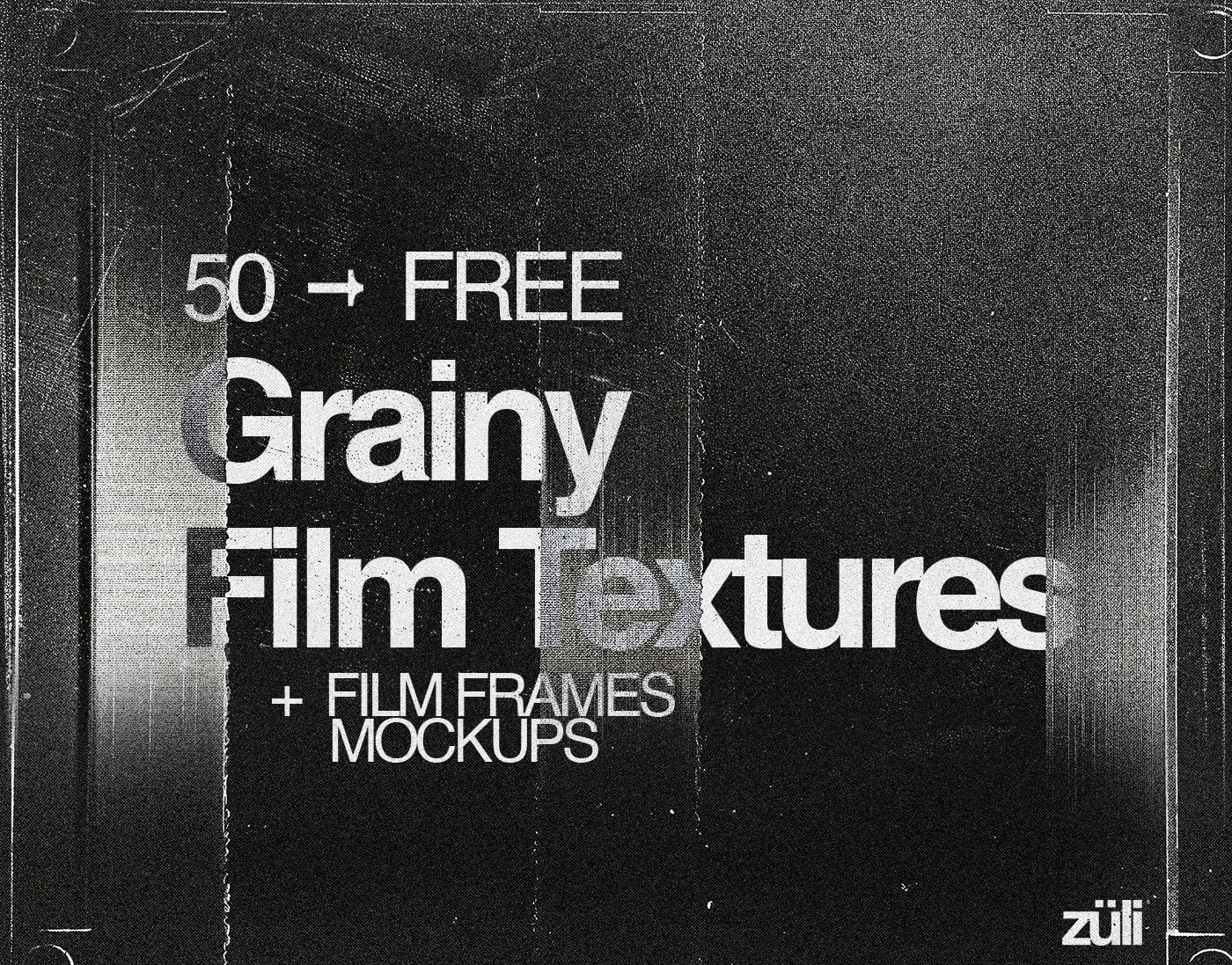 A collection of 50 grainy film textures and film frame templates for texturing and compositing. The textures are provided as 4000x4000 pixel JPG files at 300 DPI, offering various styles of film grain for digital overlays in post-processing. The package also includes three Photoshop (PSD) files containing film frame mockup templates.