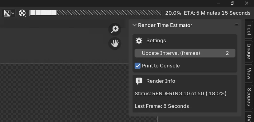 This add-on provides an estimated overall render time for animations, replacing the need to manually calculate total duration from single-frame render times. It dynamically adjusts its estimates based on the progress of the first few rendered frames and updates the remaining time and frame count as the sequence progresses. The tool adds a visual progress bar and ETA display directly to the sidebar of the Image Editor. Users can also enable an option to log detailed progress updates to the system console.
