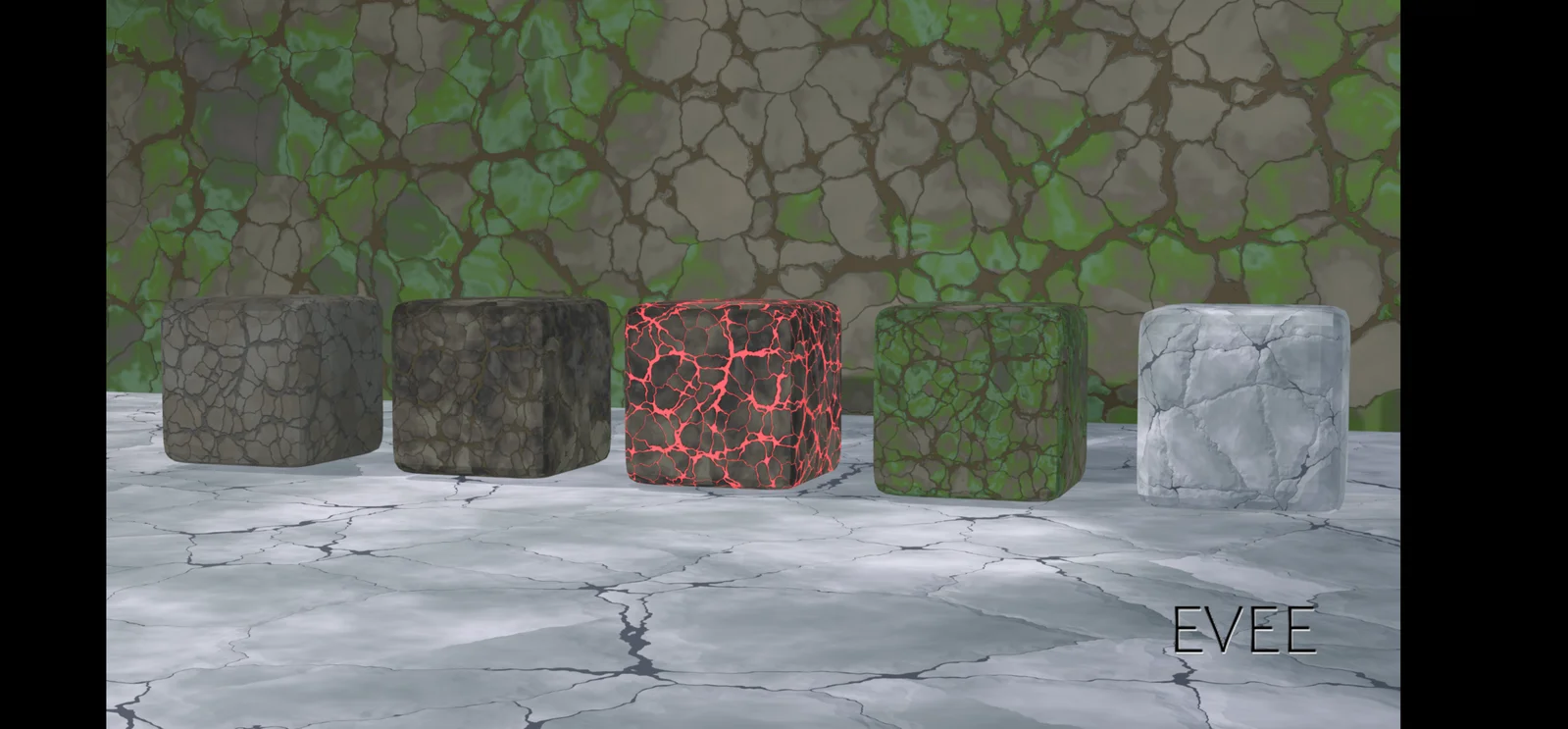 The included materials consist of a standard detailed rock texture, a marble surface with smooth gradients and veining, a lava rock material displaying molten patterns, a grass-covered rock variant for blending stone and greenery, and complementary environmental elements to tie the scenes together.