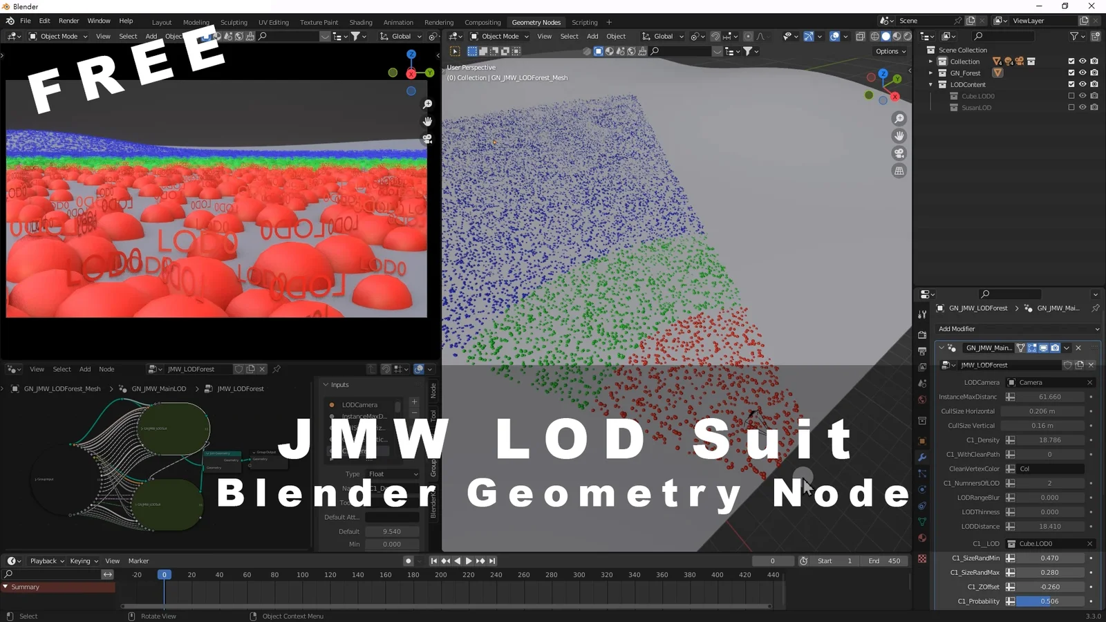 JMW LOD Suit is a geometry nodes setup for managing Level of Detail (LOD) in Blender scenes. It controls polygon counts and reduces render times by automatically swapping models based on distance. The system uses a specific naming convention (e.g., Name.LOD0, Name.LOD1) for model replacement.