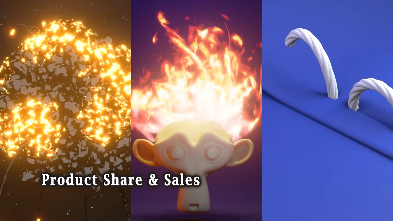 This product is a collection of procedural Geometry Nodes setups for Blender. The bundle includes files for generating visual effects such as stylized explosions, tornados, fire, and water whirlpools. It also features procedural generators for disintegration effects, dynamic painting waves, sewing stitches, voronoi towers, and woven ropes. Files are provided in both standalone appended formats and linked formats that require a separate add-on.