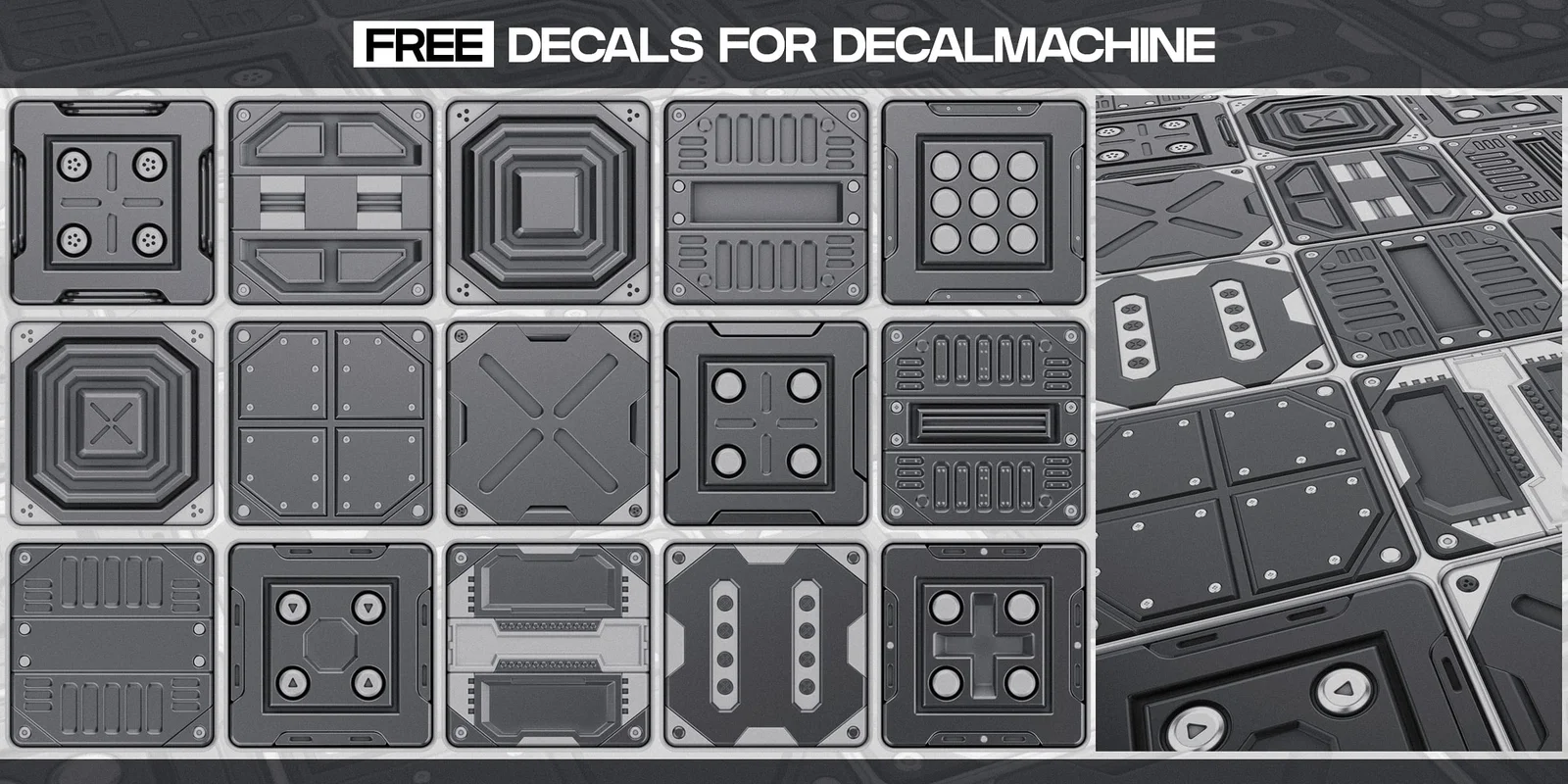 This collection includes 45 hard surface decals designed for detailing floor and wall panels. The assets are baked from 3D geometry at a 1024x1024 resolution with 4x anti-aliasing. The pack is formatted for immediate use with the Blender add-on Decal Machine and also includes 45 normal maps that can be used as hard surface stamps in Substance 3D Painter.
