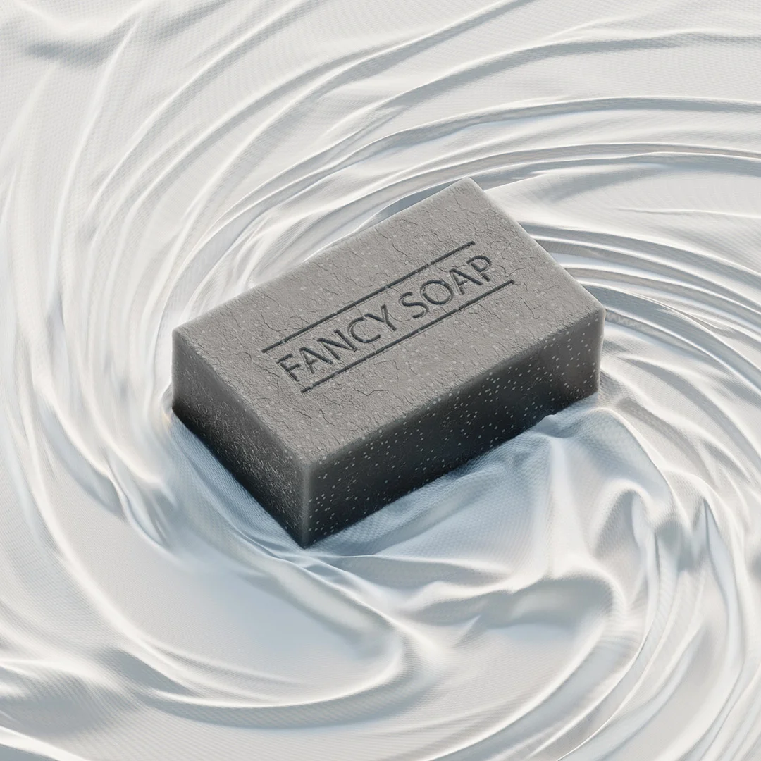 A 3D scene providing a close-up visualization of a custom soap brick resting on draped silk fabric. The project demonstrates the practical application of the Multiresolution Modifier and sculpt brushes to generate realistic fabric folds and debossed lettering on the soap surface. It also includes a node setup utilizing Cryptomatte within the Blender compositor.