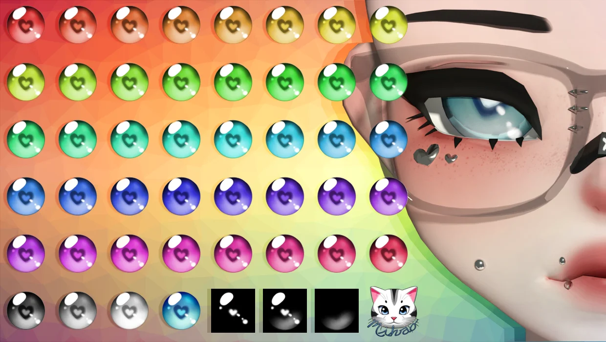 This texture collection provides 44 heart-themed eye color maps along with three emission maps. All included texture files are provided at a resolution of 512x512 pixels, suitable for character and avatar creation.