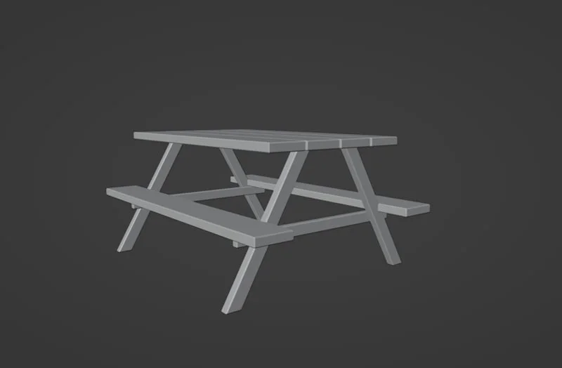 This is a 3D model of a picnic table constructed using a non-destructive workflow in Blender. The table is built utilizing Array and Mirror modifiers, allowing users to adjust its overall dimensions and proportions without permanently altering the underlying base geometry.