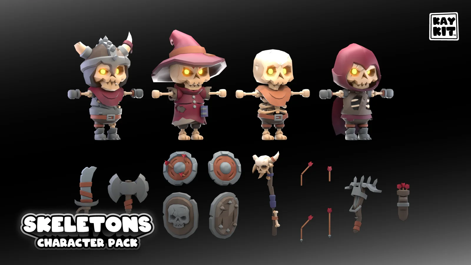 This product provides a collection of four stylized, low-poly skeleton character models designed for game development and optimized 3D scenes. The characters are fully rigged and include over 90 built-in animations. Additionally, the pack contains more than 10 weapon and accessory models, such as swords, shields, axes, and crossbows. All assets use a single 1024x1024 gradient atlas texture for optimized rendering and are provided in FBX and GLTF formats.