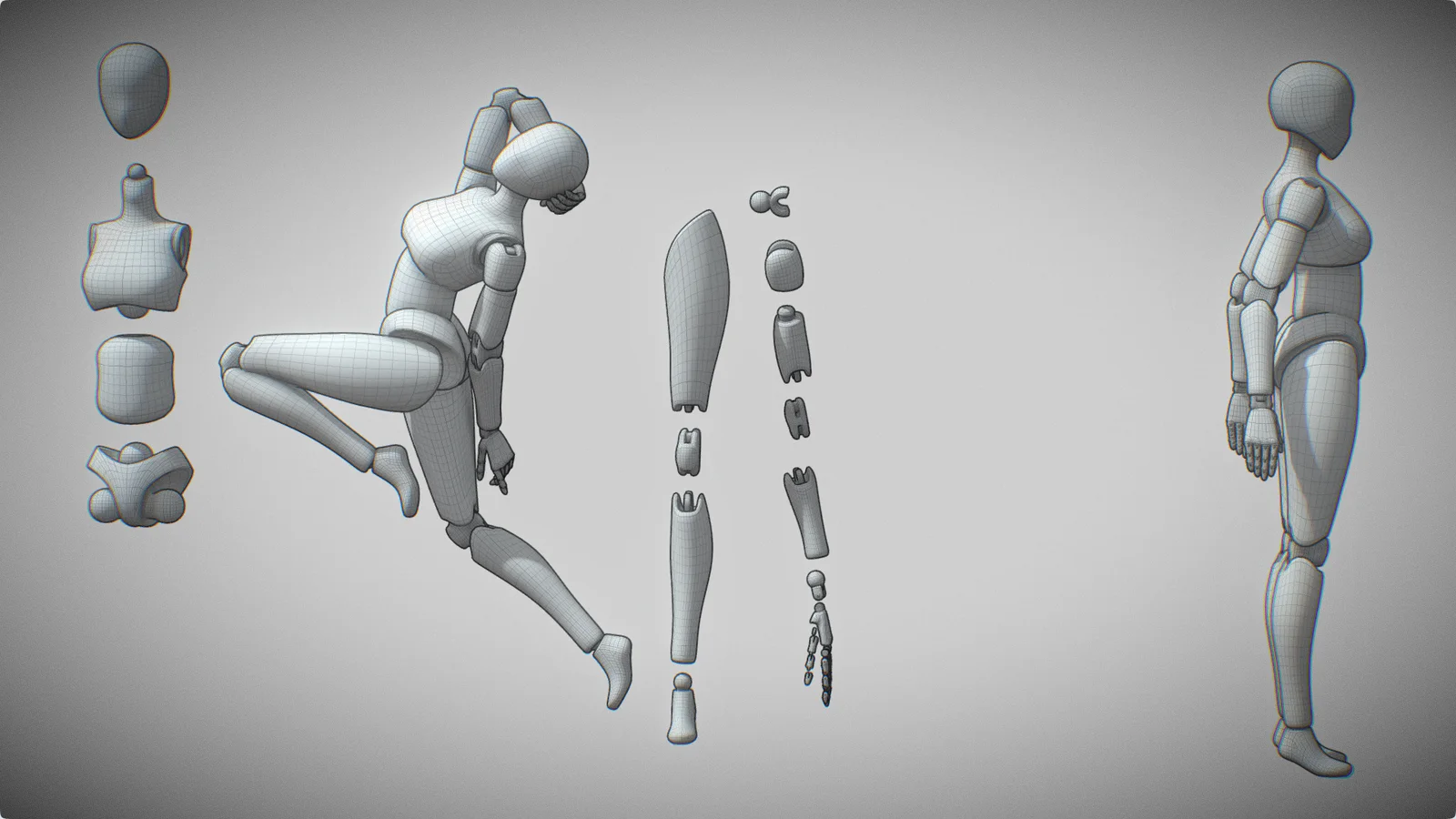 A rigged female ball-jointed doll (BJD) base mesh designed for character animation and modular use. The model features rigid body parts, making it suitable for creating robotic characters or articulated figures in game development. The asset includes detailed joint configurations, with palms based on the jointed hands BJD design by zacko. It contains approximately 409,000 vertices and 818,000 triangles and is provided in OBJ, GLB, GLTF, and USDZ file formats.