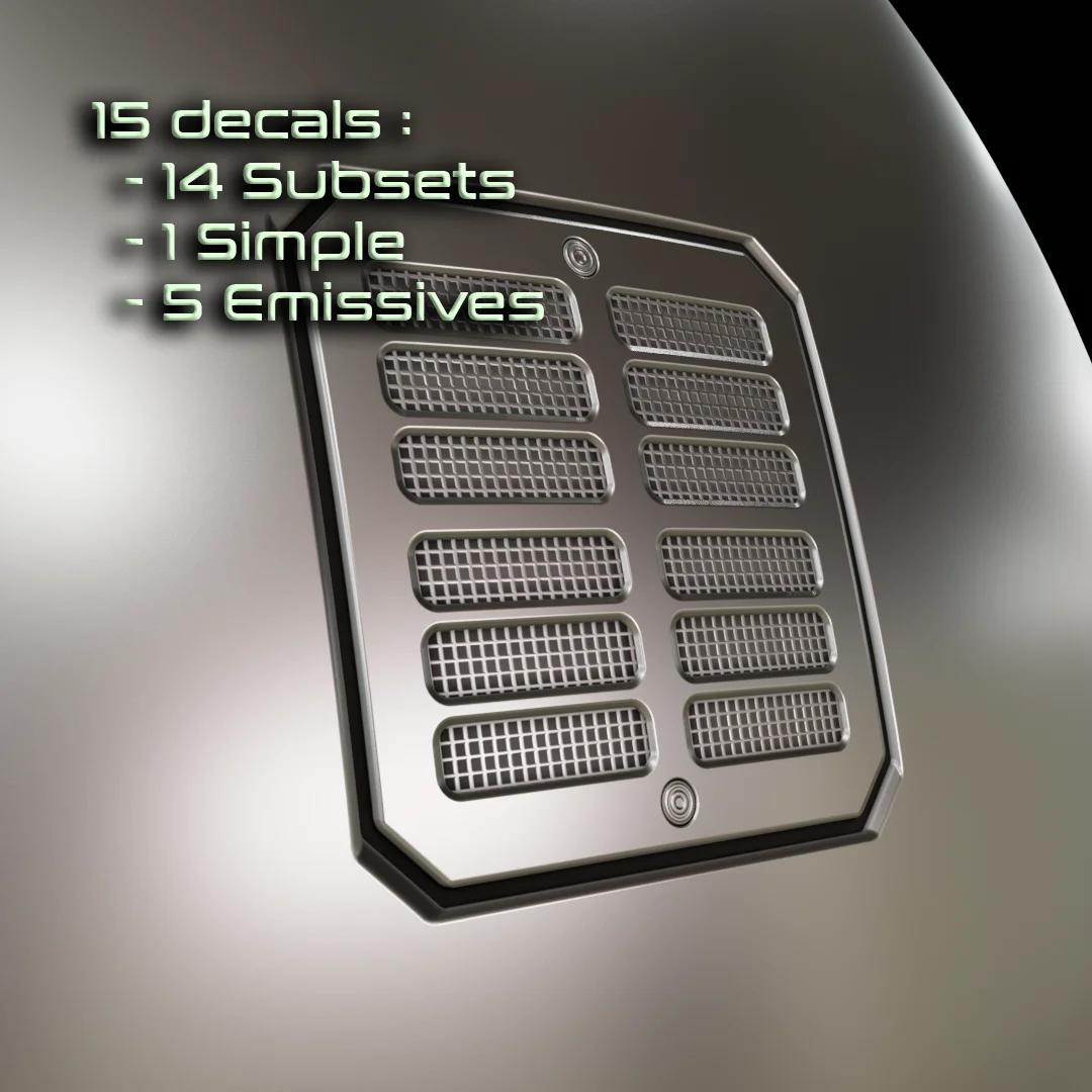 This is a pack of 15 Sci-Fi ventilation decals ready for use with the Decal Machine add-on. The pack includes 14 subset decals, which can accommodate multiple materials, and 1 simple single-material decal. Five of the decals in the collection are emissive.
