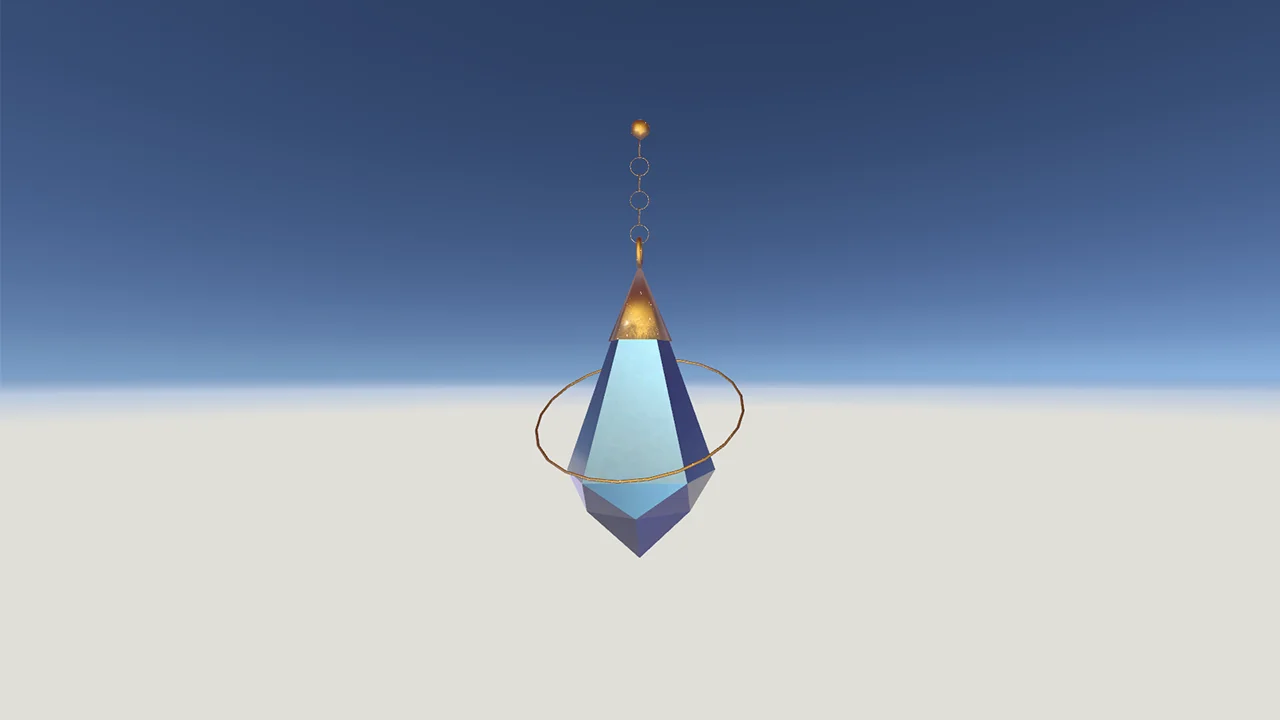 A 3D model of a crystal earring accessory. The download includes an FBX file for use in Blender, as well as a pre-configured Unity prefab that includes materials and PhysBones setups requiring Poiyomi 8.x.