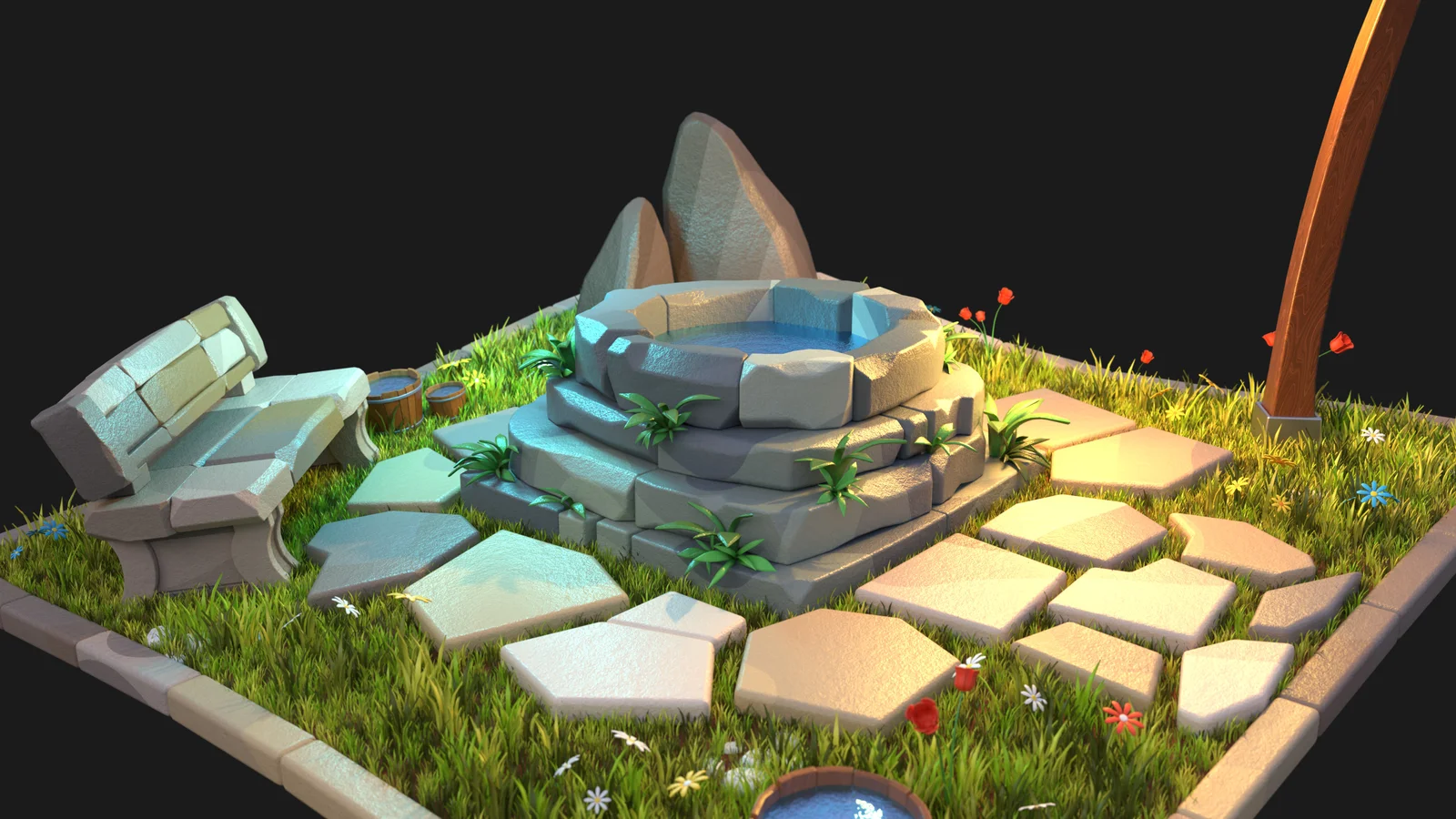 This product provides a stylized, cartoony water well diorama environment. The pocket scene is configured with a complete lighting setup and Cycles materials utilizing embedded textures. It is provided in both native Blender format and as an FBX export, designed so users can open the file and render the composition immediately.