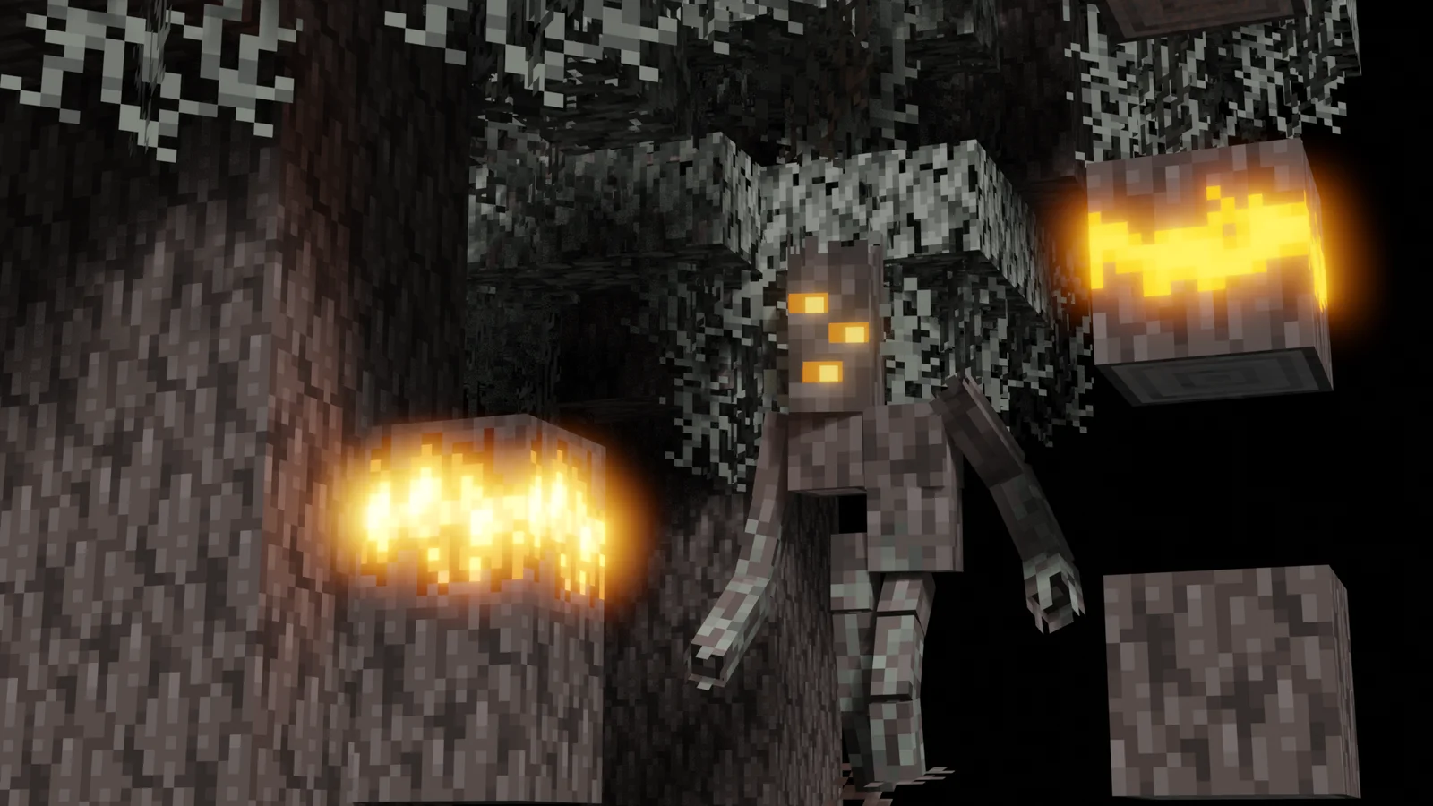 A rigged 3D model of The Creaking character from Minecraft. The setup includes the game's original textures and features a glowing creaking heart, alongside an option to toggle between boolean-cut eyes or flat textures.