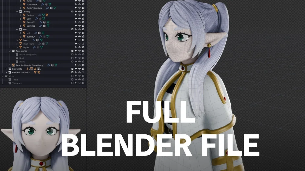 A fully rigged and UV mapped character model provided as a Blender file. The model features expression shape keys for facial animation and includes a posing setup. The file also contains character accessories and a rigged mimic prop.