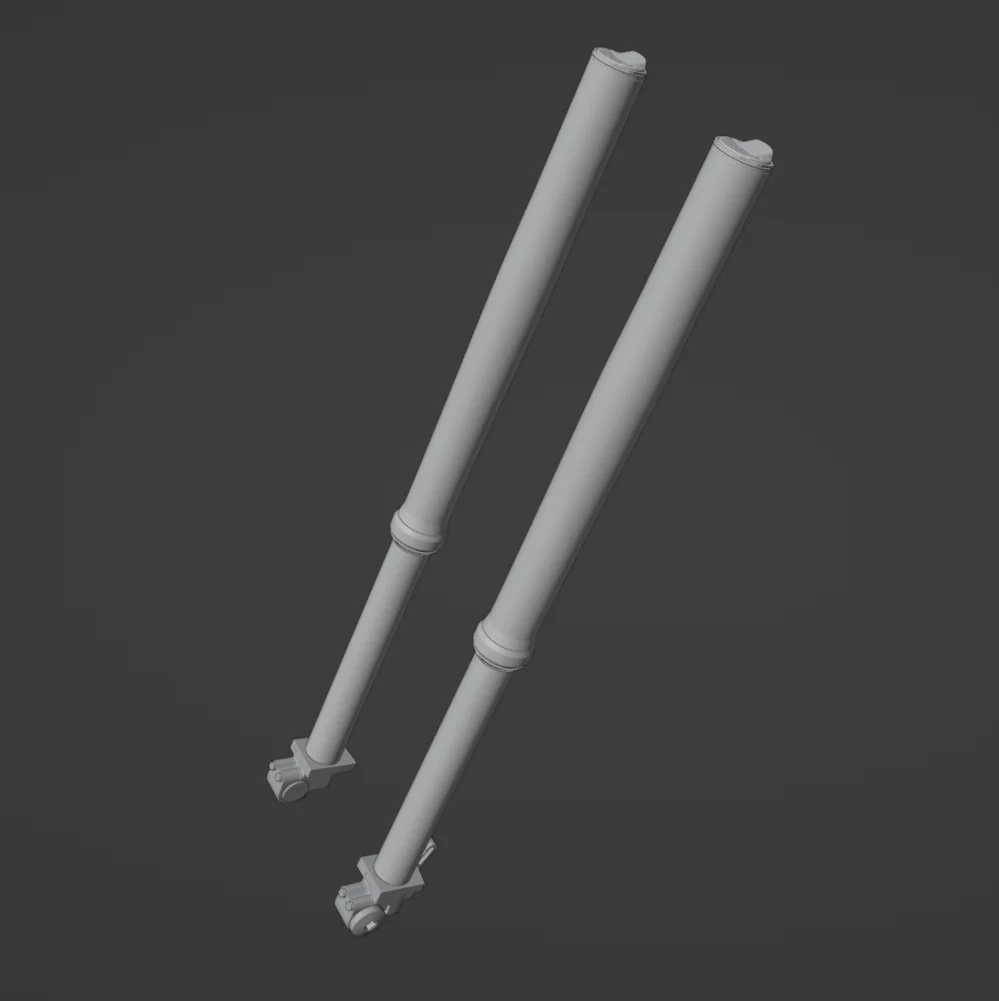 The model includes fork legs and lower forks constructed in Blender, along with triangulated top caps created in Fusion 360. The files are provided in .Blend and .OBJ formats. Please note that the commercial textures used in the promotional images are not included due to licensing restrictions, so materials will need to be re-applied after importing.