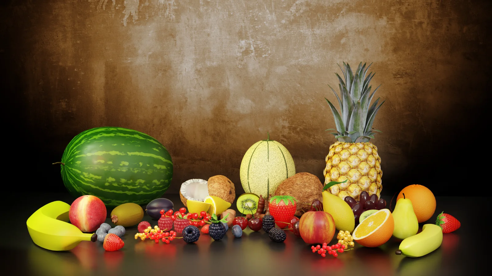 A collection of 24 distinct 3D fruit and nut models designed for scene population and still life compositions. The package contains common produce such as apples, bananas, and oranges, along with various berries like strawberries, blueberries, and gooseberries. Tropical items including coconut, pineapple, and tamarind are also included.
