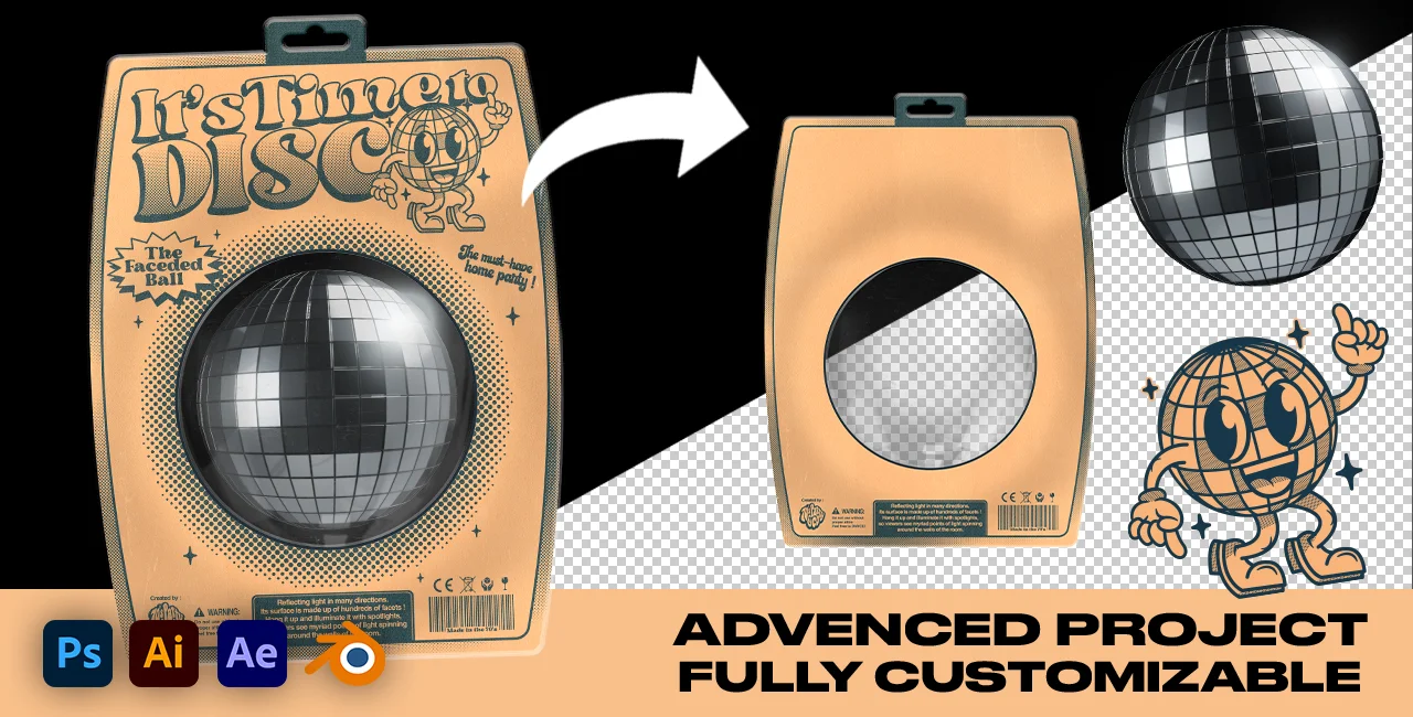 This project provides a complete set of files to customize a retro 1970s and 1980s-inspired disco ball and character packaging design. The asset includes the 3D setup in a Blender project file, alongside vector and raster graphic templates in Illustrator and Photoshop formats. An After Effects file is also provided for motion graphics and compositing.
