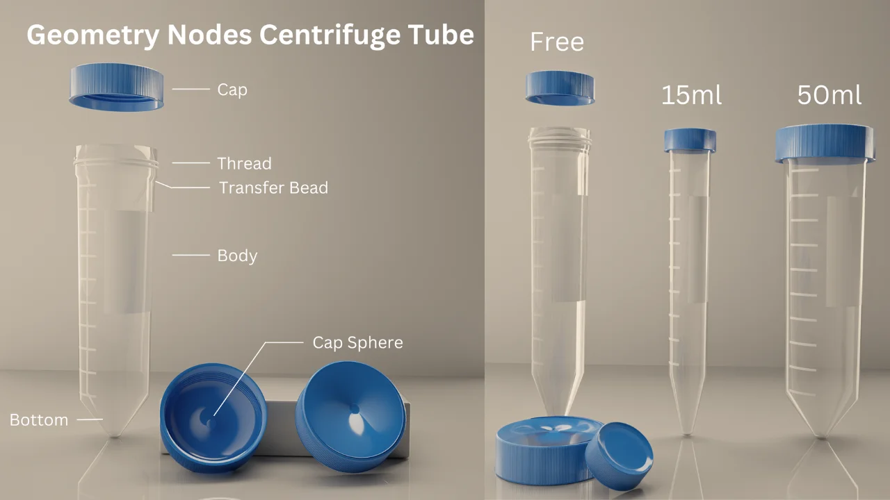 This Geometry Nodes setup generates procedural centrifuge tubes for laboratory and science visualizations. Users can toggle between standardized preset sizes, such as 50ml and 15ml, or manually define custom dimensions through the node parameters. The setup also includes a toggle for procedural cap generation and comes with ready-to-use materials applied to the generated meshes.