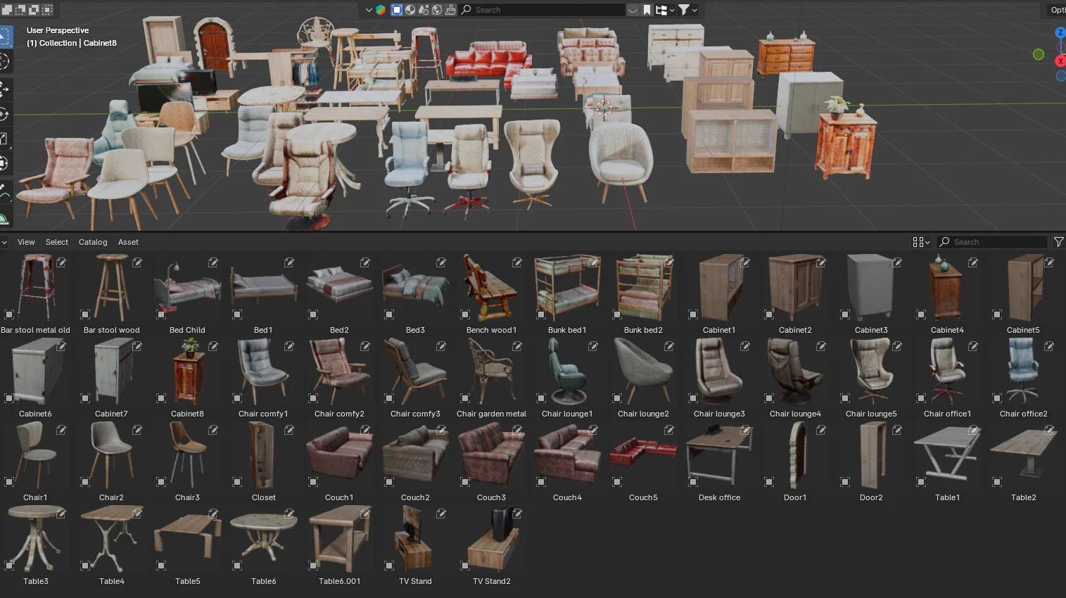 This asset library contains 39 low-detail furniture models designed for medium-distance rendering, background details, and isometric scenes. The collection includes a variety of household items such as chairs, lounge chairs, tables, cabinets, beds, and doors. The files are pre-configured for direct integration into the Blender Asset Browser.
