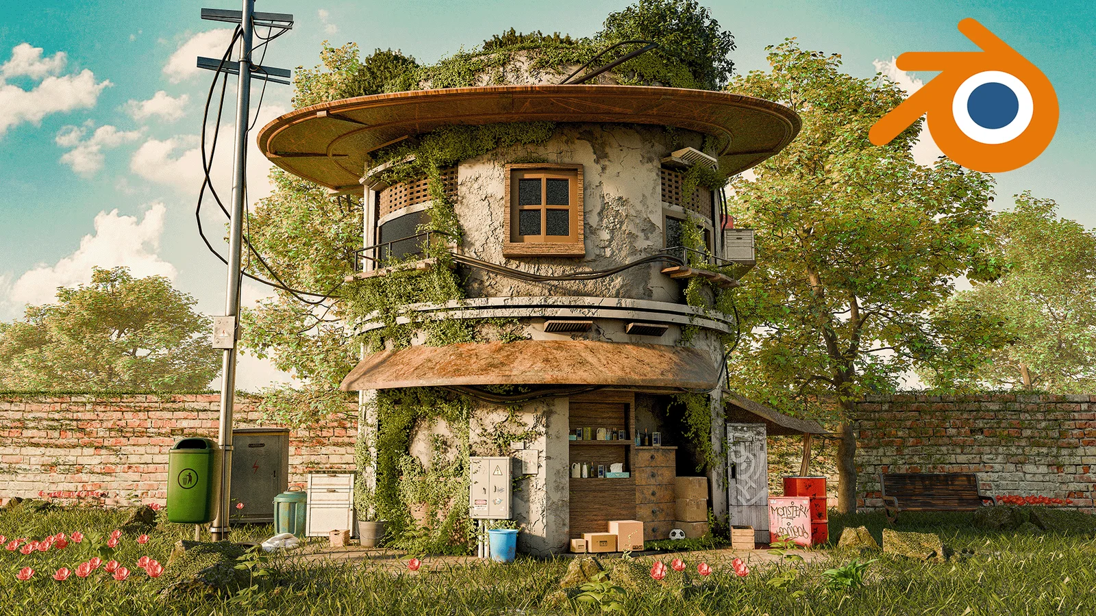 A complete 3D village environment scene provided as a Blender project file. The layout features a high-poly ground plane with integrated grass elements, which can be disabled in the viewport to improve navigation performance.