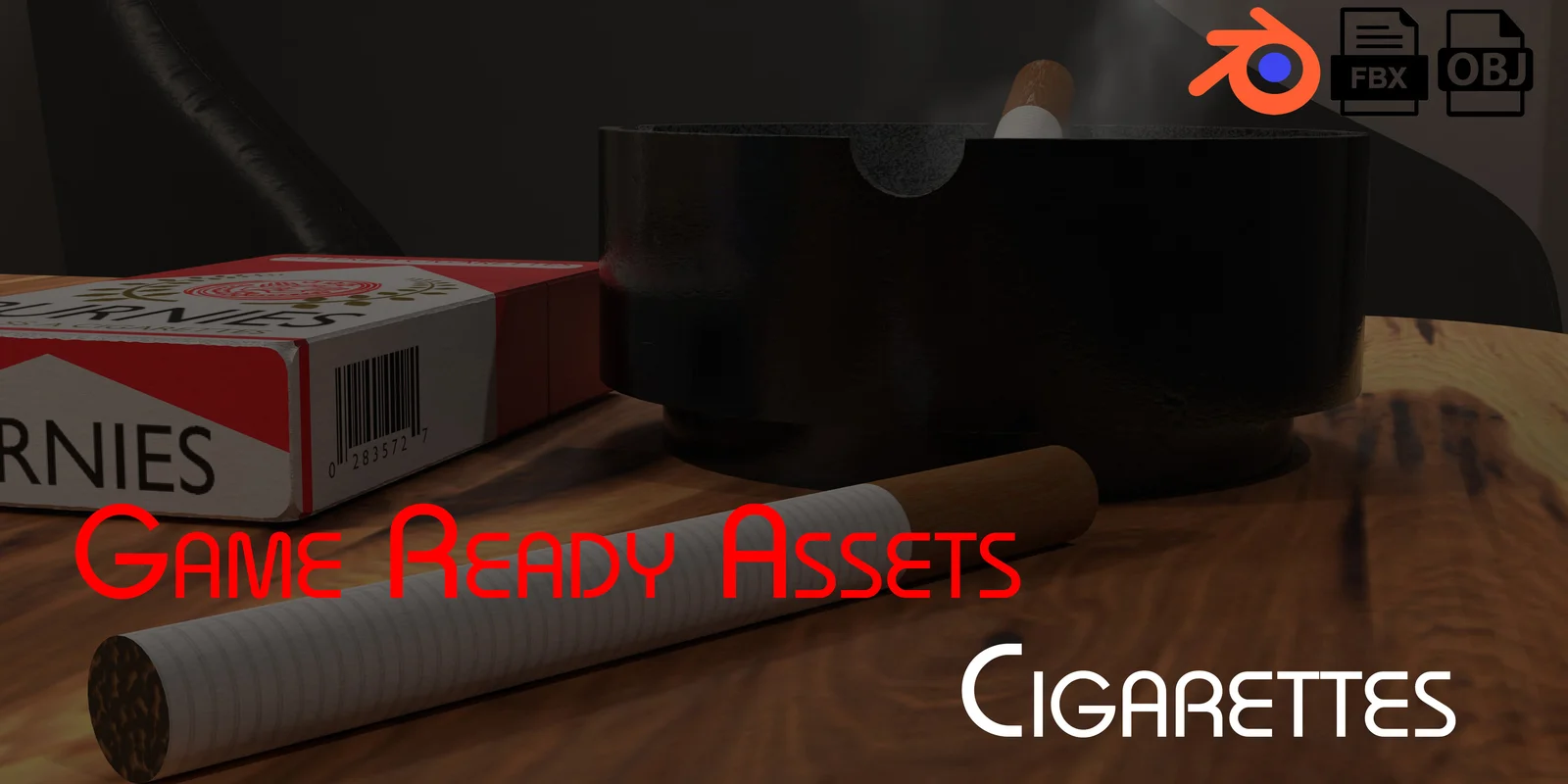 This asset pack contains five game-ready 3D models focused on cigarettes and ash. The collection includes a lit cigarette, an un-lit cigarette, individual ashes, a pile of ash, and an ashtray. The lit cigarette comes with two diffuse map variations, offering versions with and without lipstick marks.
