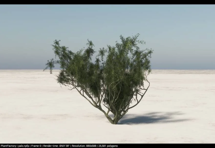 This game-ready Palo Verde tree model is optimized for real-time applications. It includes two levels of detail (LOD0 and LOD1) and a billboard mesh for distant rendering. The geometry incorporates vertex painting on the red channel, which can be utilized for wind displacement or color variation effects in game engines. The asset is provided in FBX, OBJ, and .blend formats.