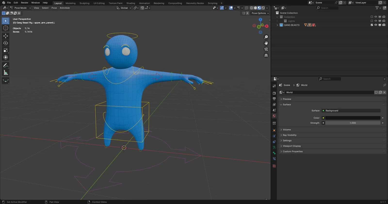 This product provides a rigged 3D model of the default character from the game Gang Beasts. The model features clean topology optimized for animation performance. It includes a complete Rigify-based control setup for intuitive posing and character animation manipulation. Additionally, the rig incorporates shape key drivers controlling two eyelid shape keys for basic blinking and facial expressions. The current version includes the default skin and does not feature costumes or ragdoll physics bones.