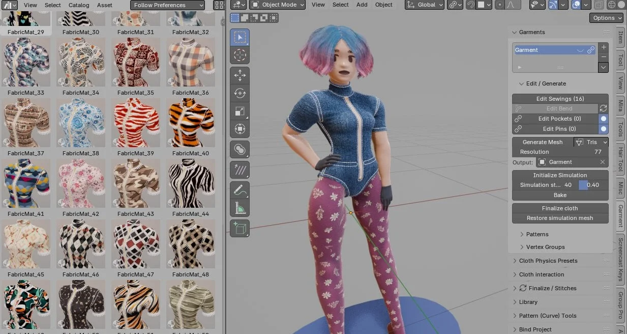 Garment Tool is an add-on for designing and simulating clothing meshes directly from 2D Bezier curves. It allows you to draw sewing patterns, connect segments in the 3D viewport, and generate an evenly triangulated, simulation-ready mesh with adjustable polygon density.