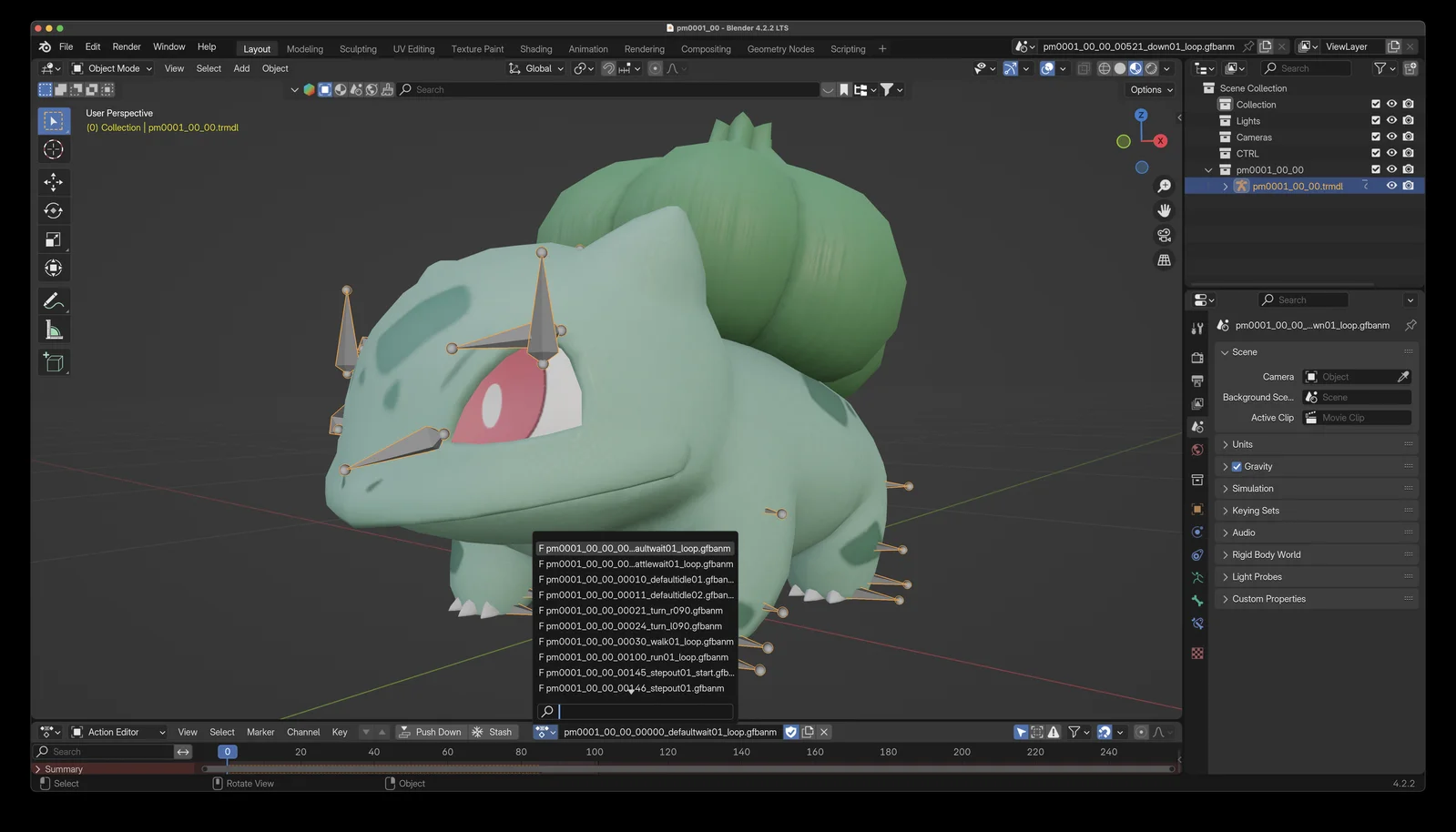 A collection of 3D models and accompanying animations for Generation 1 Pokémon (001-151), prepared for Blender 4.3 and newer. The pack includes Mega Evolutions and Regional forms, with assets converted from titles such as Scarlet & Violet, Let's Go Pikachu, and Sword & Shield. Users can switch between different idle, movement, and attack animations using Blender's Action Editor. Textures are embedded directly within the individual blend files.