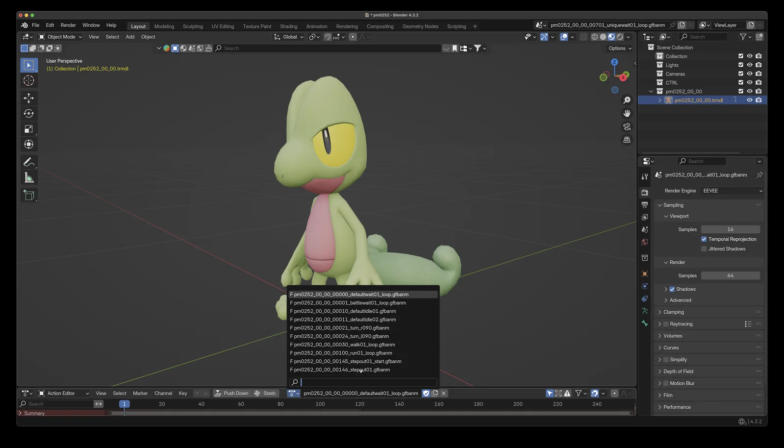 This collection provides Blender-ready 3D models of Generation 3 Pokemon, covering Pokedex entries 252 through 386. The models feature pre-configured animations that can be accessed and switched using Blender's Action Editor.