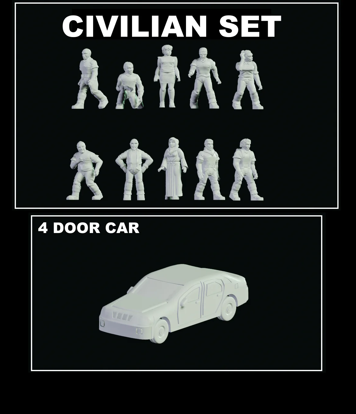 A collection of 3D printable civilian miniature figures scaled to 1/100, which corresponds to an 18mm height often referred to as 15mm scale tabletop miniatures. The set includes ten distinct generic civilian characters, a civilian engineer figure, and a four-door car model with options for attached or separated wheels.