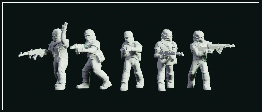 A collection of six generic insurgent figures designed for 3D printing. The models are scaled to 1/100, where a human figure measures 18mm from toe to head. Prseupported files are included for 1/100 scale printing.