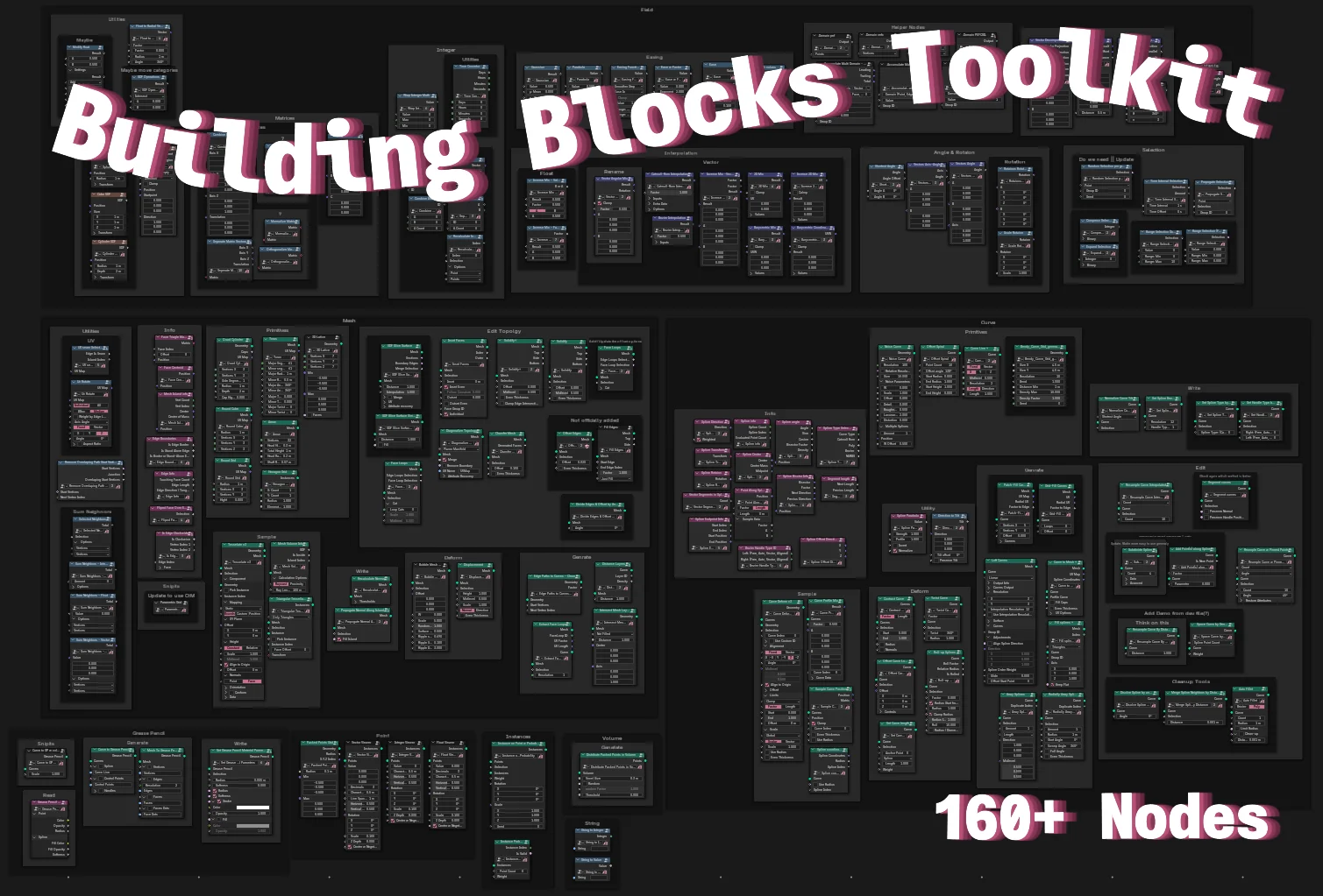 An asset pack comprising over 160 custom node groups for Blender's Geometry Nodes editor. These structures extend the default capabilities of the built-in procedural system, acting as foundational components for complex node setups. The collection includes various utilities for manipulating mesh and curve data, featuring specific tools like recalculate normals, mesh topology editing functions, and curve lofting.